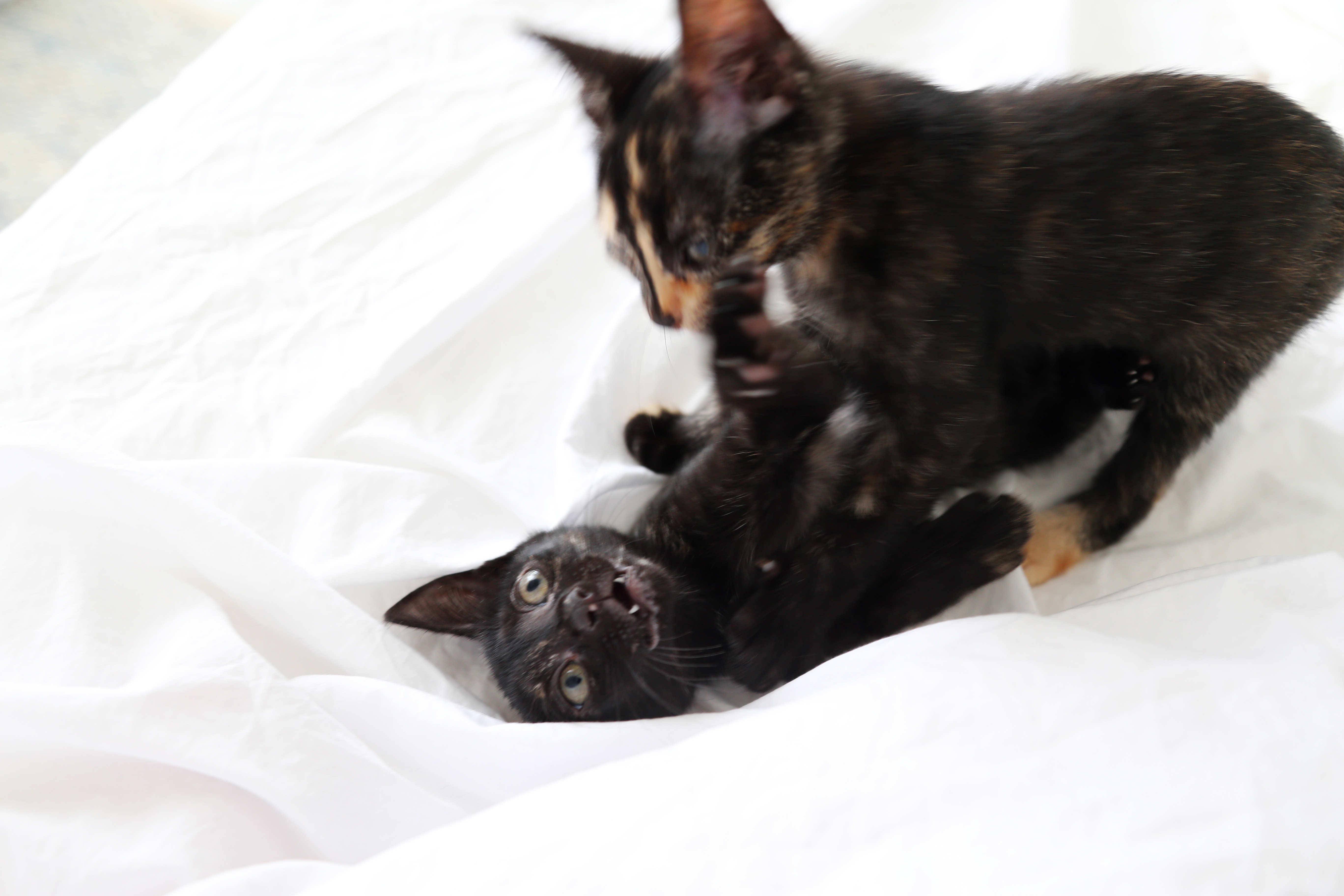 We rescued Pipper and Pepper from a Dutch kitten factory. The cats in the house looked in bad shape, the environment unsanitary and we discovered cats and kittens were inbred (when you breed daughter with father or mother with son) and line-bred (when you breed siblings). We had to pay a ridiculous amount of money for them to give us the kittens and we only agreed to this because we knew we couldn´t stop them. Kittens that were not sold stayed there and were bred again and again so we decided to change the future of these 2 little girls that arrived home screaming and shaking like leafs.