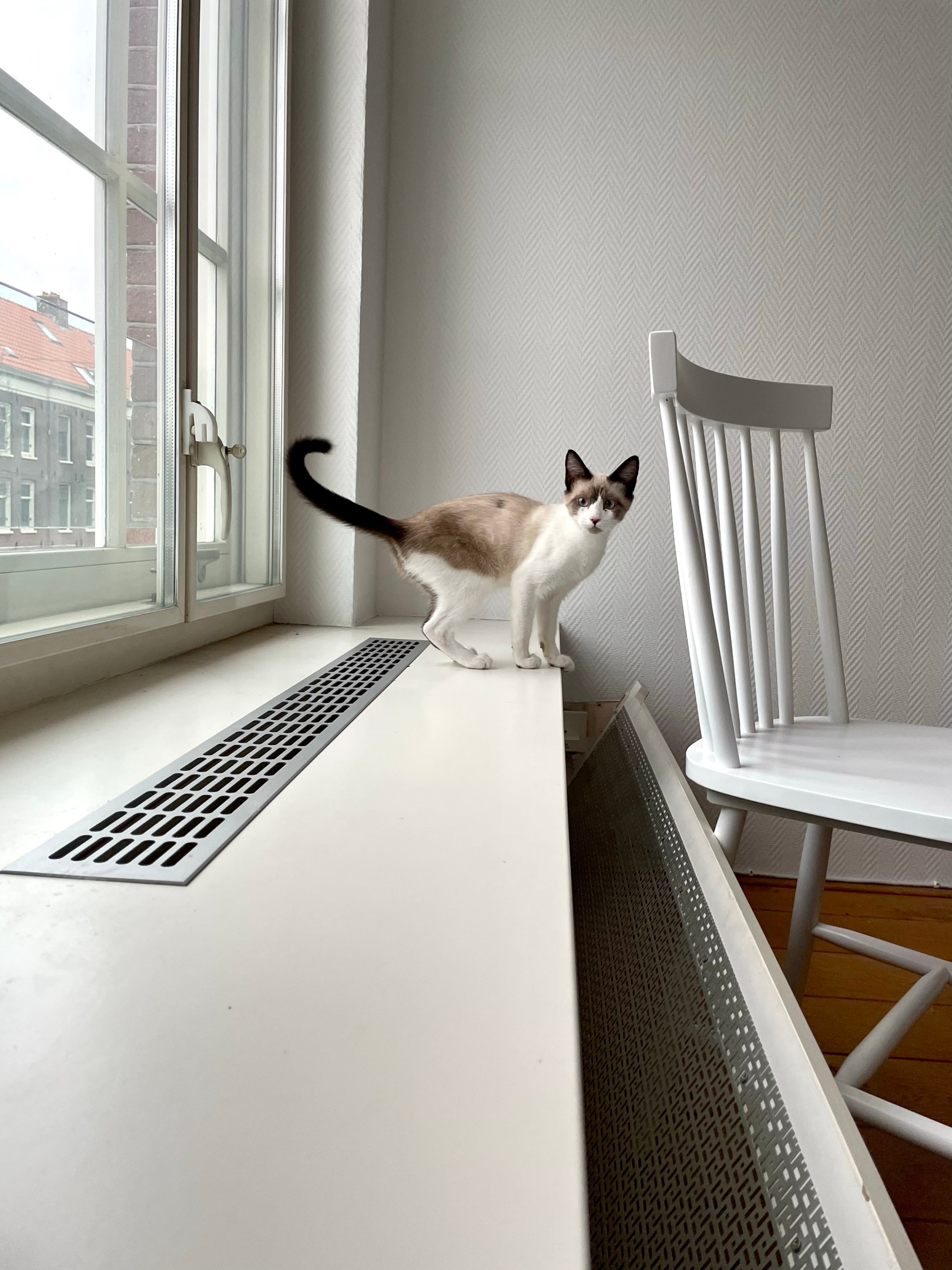 There’s a friendly cat or dog (or both) who is not super high energy. Dasher likes to snuggle and play softly, she’s very lady-like and doesn’t like a tom-boy energy of a cat who’s going to jump on her face, she’s very small and a siamese to the T, always looking for a cat to lay next to and cuddle with and that’s why another pet in the house is a must.